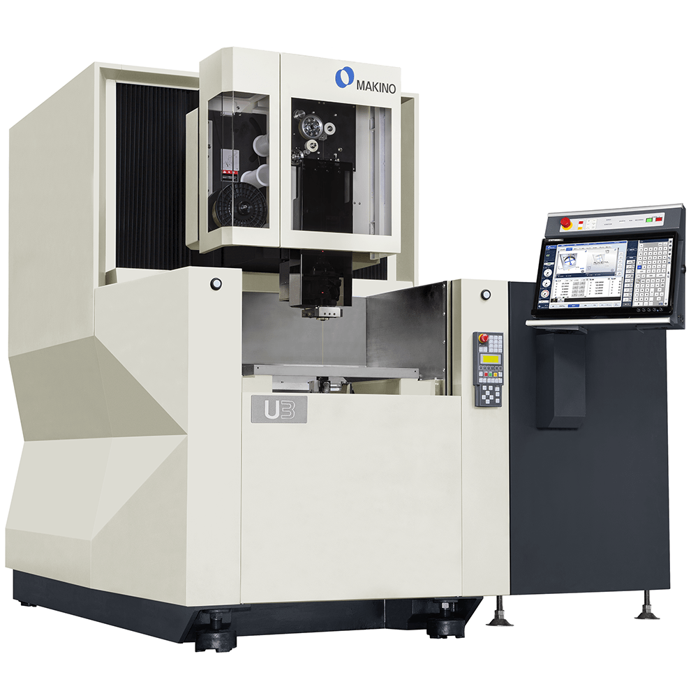 The Makino U3 Wire EDM provides an ideal mix of speed, accuracy, and surface finish capability to tackle the most demanding applications. The machine utilizes a stationary work table design that delivers repeatable accuracy regardless of work piece size or weight. Excellent access to the work tank is provided through the pneumatic raise and fall front door, and the operator can access the underside of the work piece or lower machine head even with a large work piece on the table. The U3 machine uses a space-savings design that integrates the di-electrode reservoir into the base machine casting, reducing the footprint while improving thermal stability.